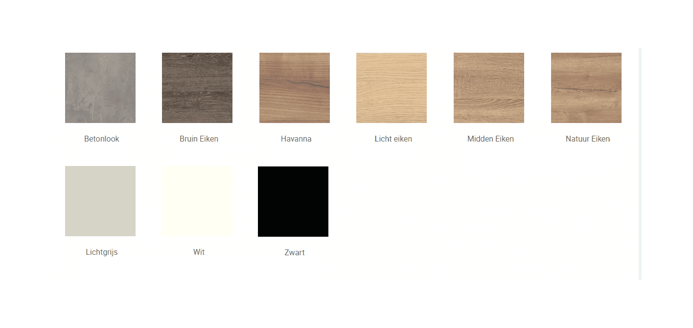 Bladkleuren: Betonlook, Bruineiken, Havanna, Lichteiken, Midden eiken, Natuureiken, Lichtgrijs, Wit, Zwart